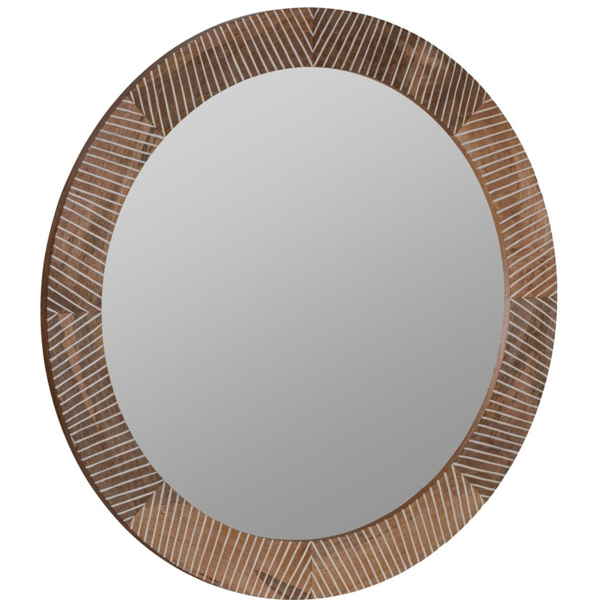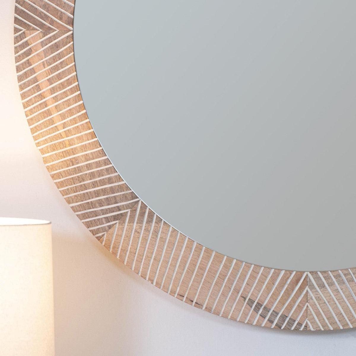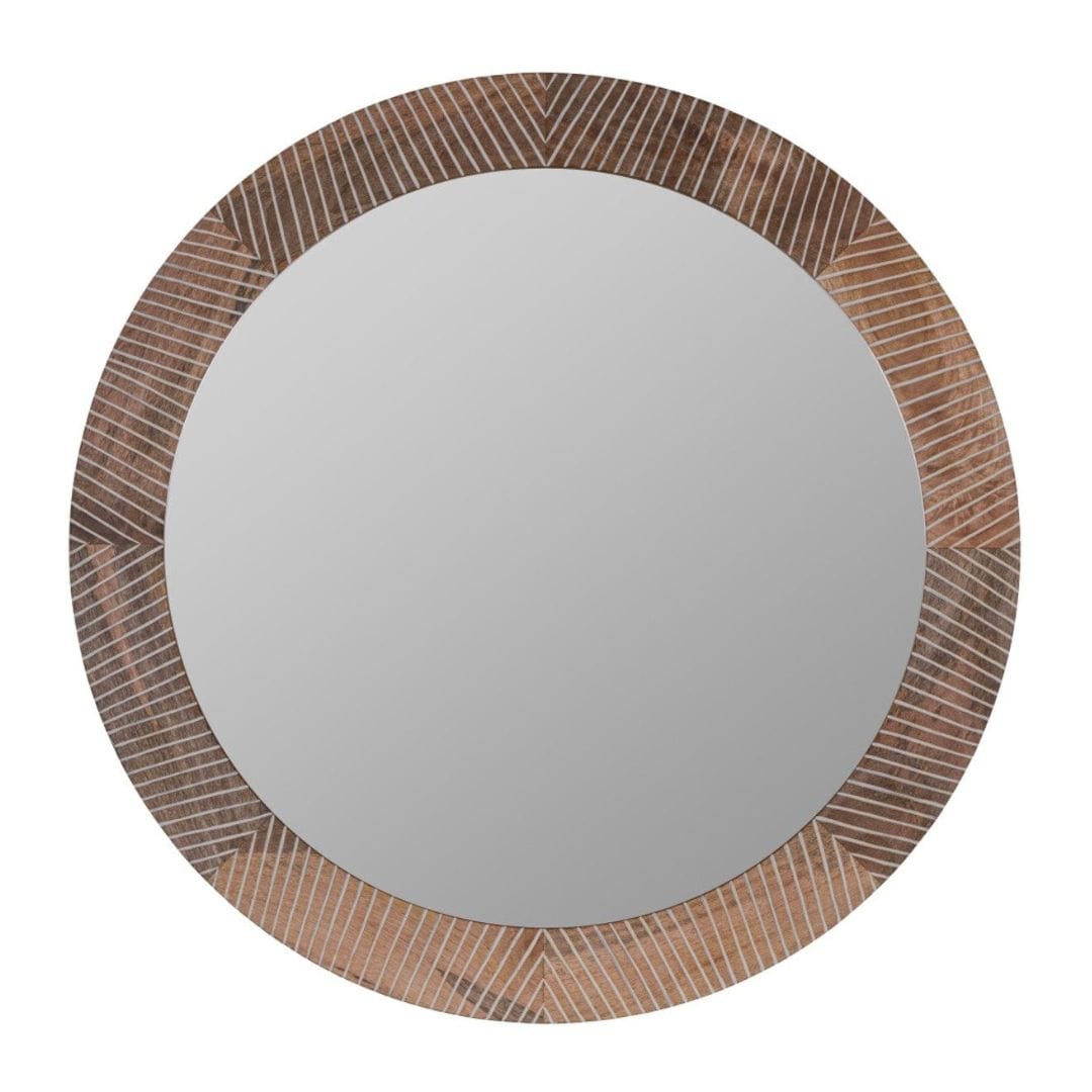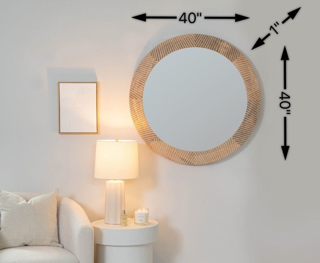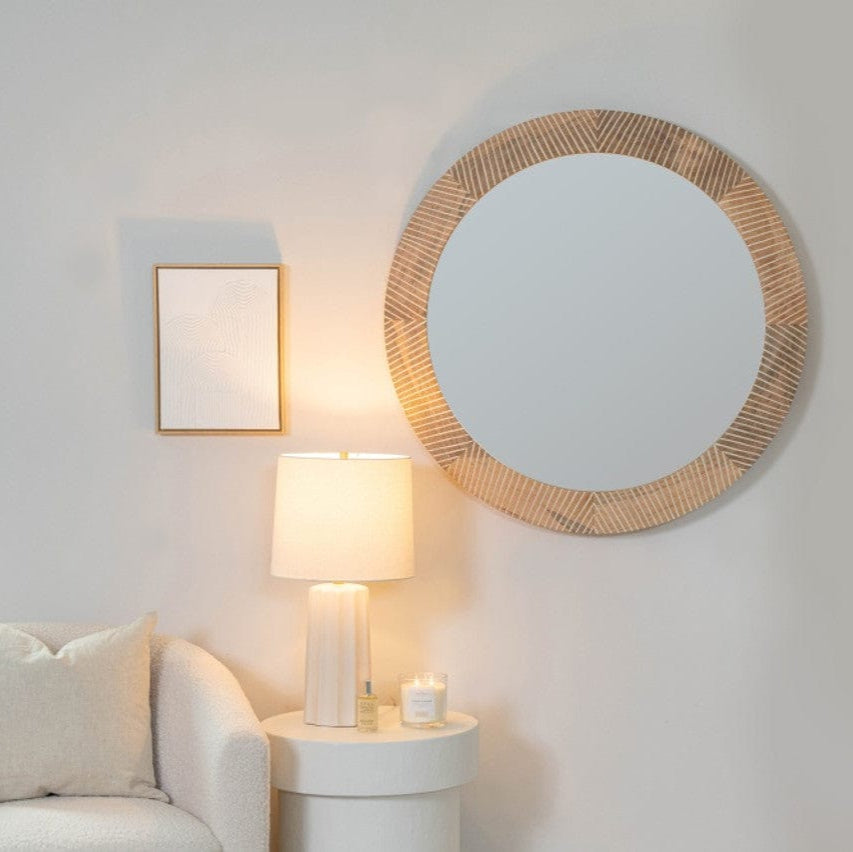 Grounded, sculptural, and quietly striking. This mirror’s round mango wood frame is etched with subtle chevron lines that add depth without stealing the scene. A go-to accent for warm, modern spaces—from curated entryways to relaxed bedroom corners.