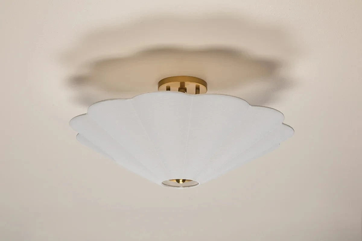 The Alana Semi Flush Ceiling Light keeps things light and airy. A pretty scalloped shade in white linen is adorned by aged brass accents. Can be mounted as a semi-flush ceiling light or pendant.