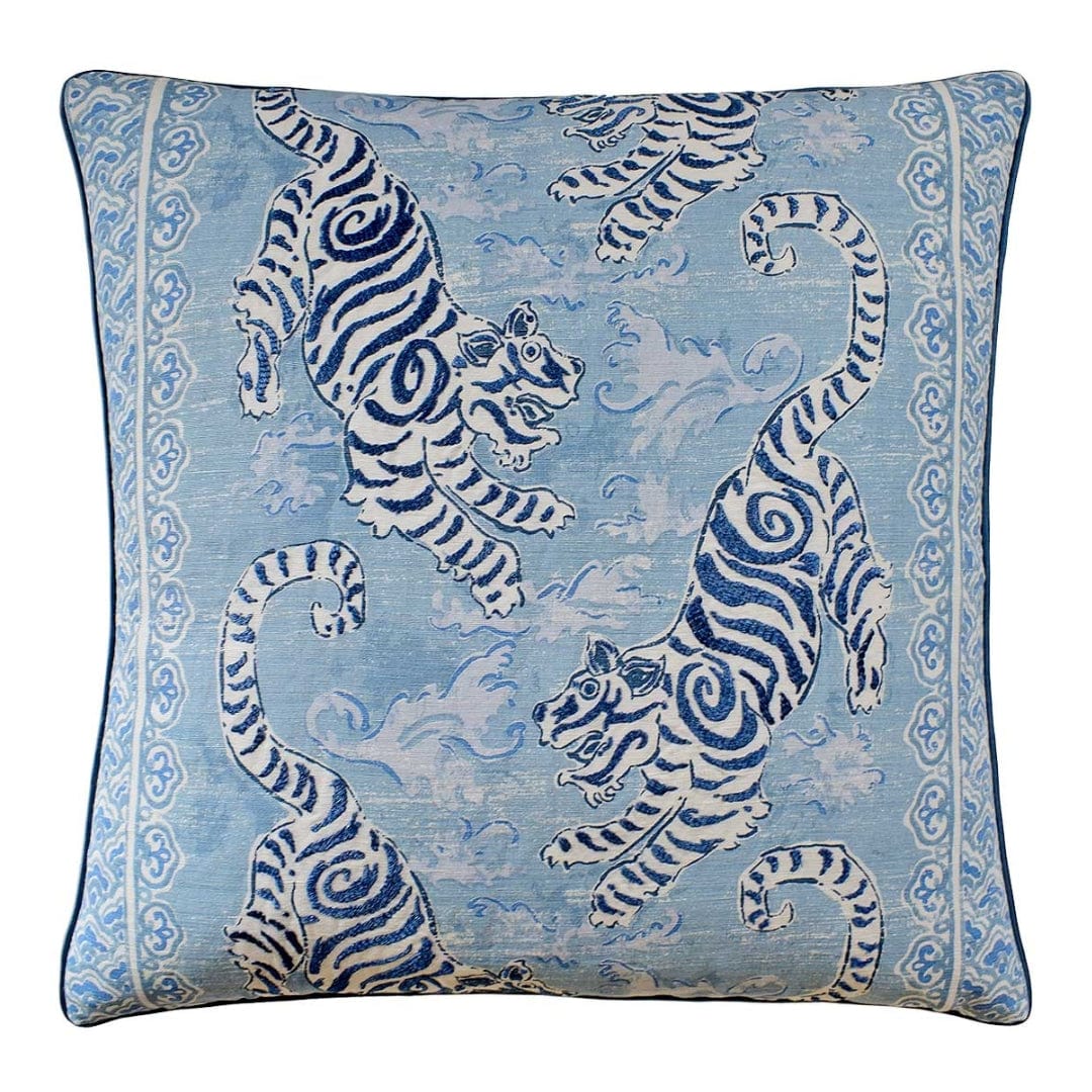 Whimsical yet striking, this pillow features a lively tiger motif in soft sky blue tones that feel playful without overpowering. The ornate pattern and rich texture bring depth, while contrast piping gives it a crisp, finished edge. A fun and fearless accent for layered bedding, statement chairs, or mixing into an unexpected gallery of prints.