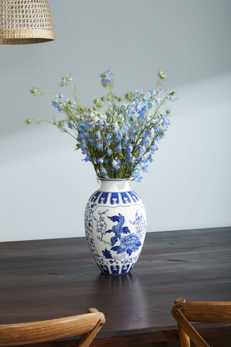 Immerse your space in timeless sophistication with the Elodie Vessel. Hand painted with blue-colored floral patterns on white stoneware, this modern vase effortlessly combines classic chinoiserie with contemporary functionality. Its tapered neck and flared opening add an elegant touch, making it the perfect addition to any wedding or event design.
