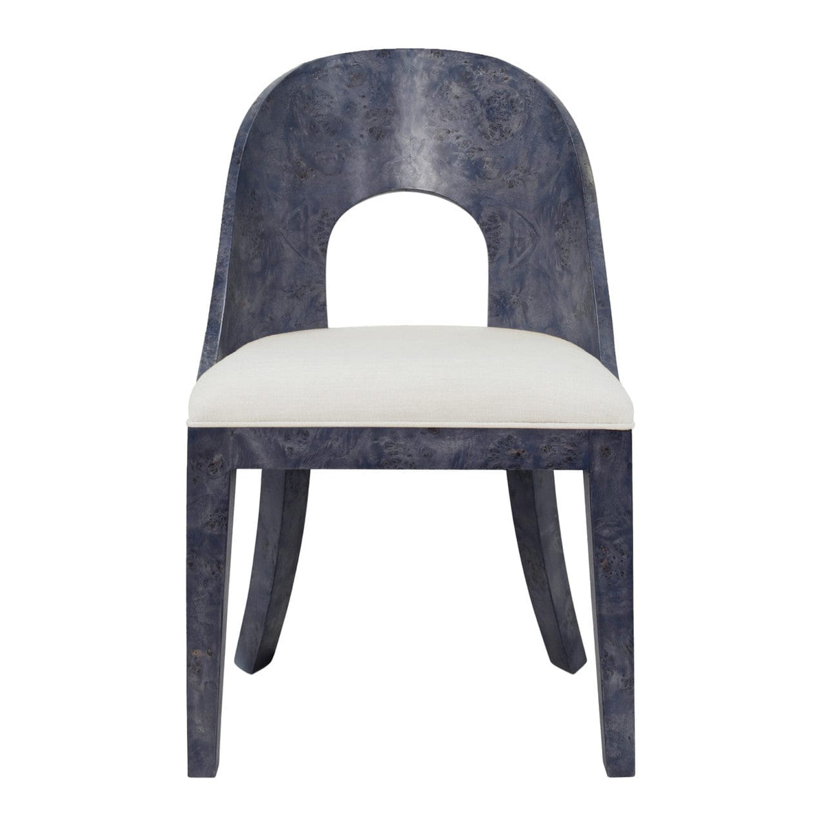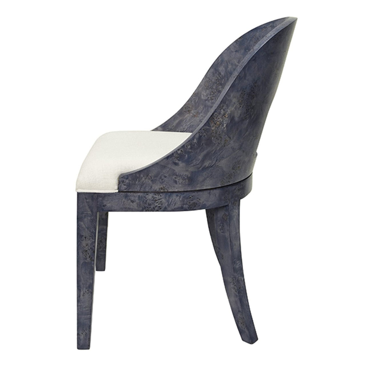 A fresh take on classic elegance, this dining chair brings fluid curves and natural texture into focus. Wrapped in richly grained burl wood, its gently arched back and sleek legs feel sculptural without being showy. The white performance linen seat adds softness and balance, making it an inviting staple for elevated everyday dining.