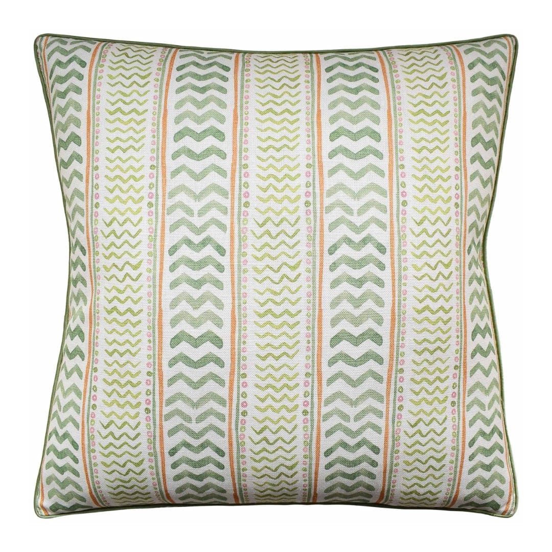 A playful take on structure, this patterned pillow features rows of chevrons and organic lines in fresh sage and soft pink tones. Its balanced design adds a lighthearted rhythm to any space, perfect for a relaxed bedroom or a sun-filled reading corner.